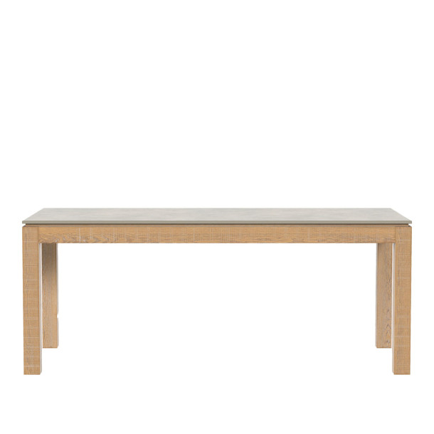 Mesa de comedor fabricada en roble macizo, esta magnífica mesa presenta un acabado ligeramente envejecido y un tablero de piedra sinterizada en un cálido gris, con capacidad para 6-8 personas. Su exclusivo acabado con efecto aserrado le da un aspecto distintivo y lleno de carácter.