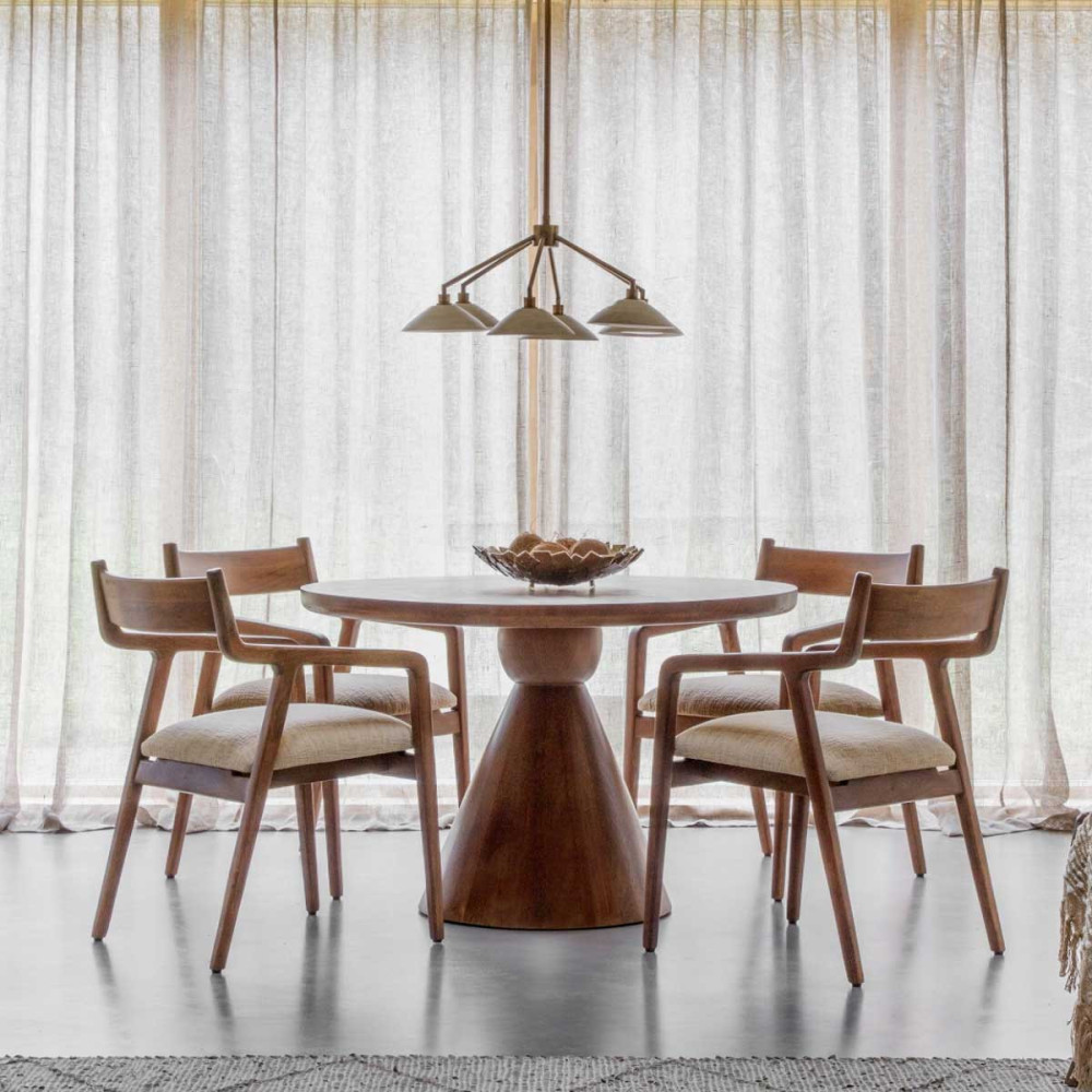 La Mesa de Comedor Redonda de Madera Monterey es una pieza contemporánea impresionante, fabricada con madera de mango maciza de alta calidad. Su superficie lisa y pulida está acabada con una rica mancha oscura que resalta la veta natural. La elegante tapa circular se combina elegantemente con una base moderna inspirada en un cono, creando un aspecto sofisticado que complementa tanto interiores modernos como tradicionales. Disponible en 116.5 cm de diámetro y 76 cm de altura, con capacidad para 4 a 6 personas. Requiere un montaje sencillo. Combínala con las sillas de comedor Monterey para una experiencia de comedor perfecta.