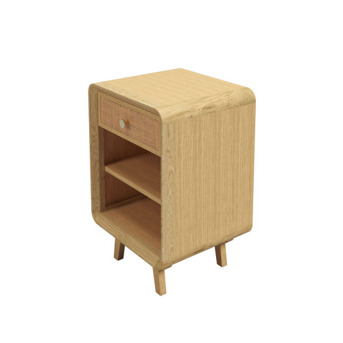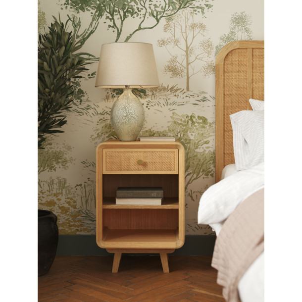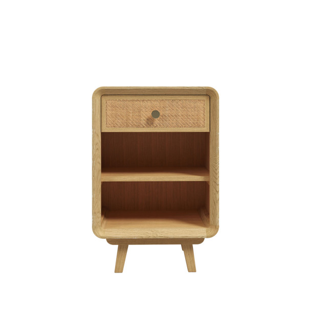 Mesilla de noche Millen, en una combinación de roble y ratán, elaborada con roble macizo y chapa de roble, con un frente de cajón de ratán y herrajes dorados. Esta mesita de noche tiene un cajón y dos estantes que ofrecen mucho espacio para tus objetos esenciales.