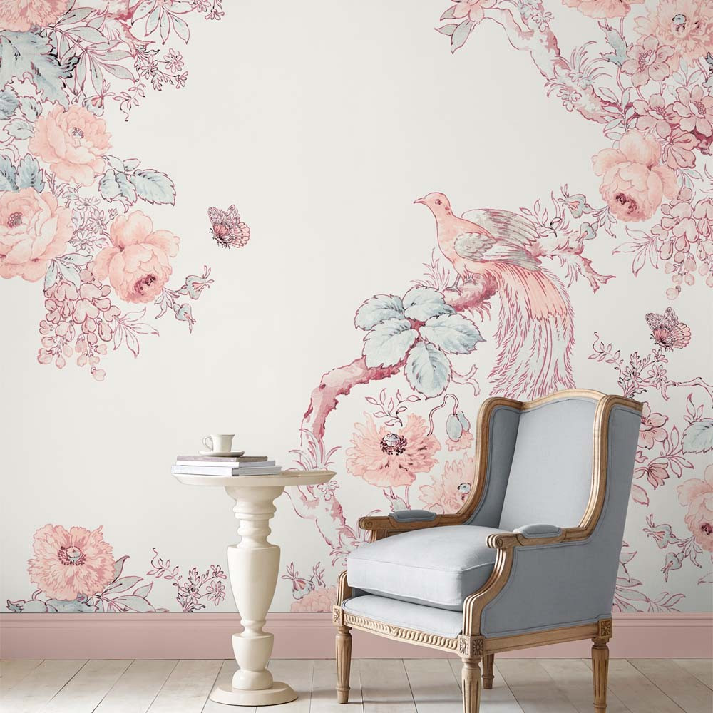 Como el bello grabado donde grandes flores acogen aves del paraíso y mariposas, ete mural de pared es una opción perfecta para completar una pared en cálidos tonos rosas.