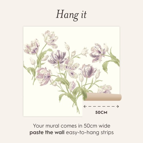 Mural de papel pintado con tulipanes grandes en tonos Grape, ideal para destacar cualquier espacio.