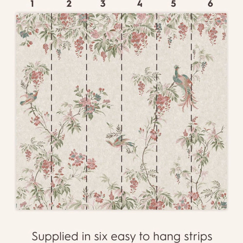 Mural de papel pintado con aves exóticas, follaje y flores en tonos Multi / Sage, ideal para interiores con estilo y encanto natural.
