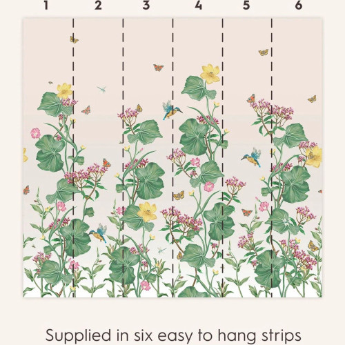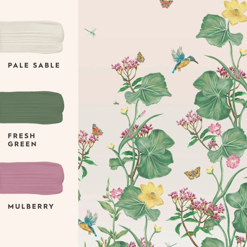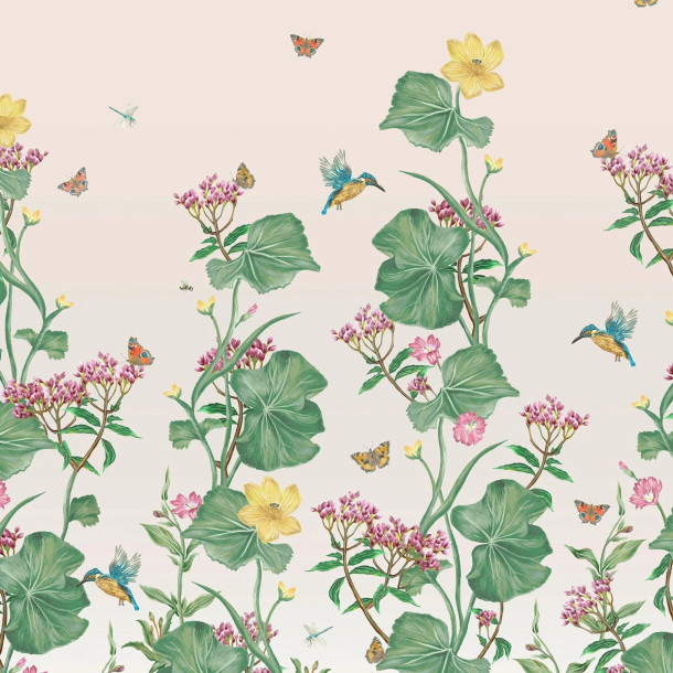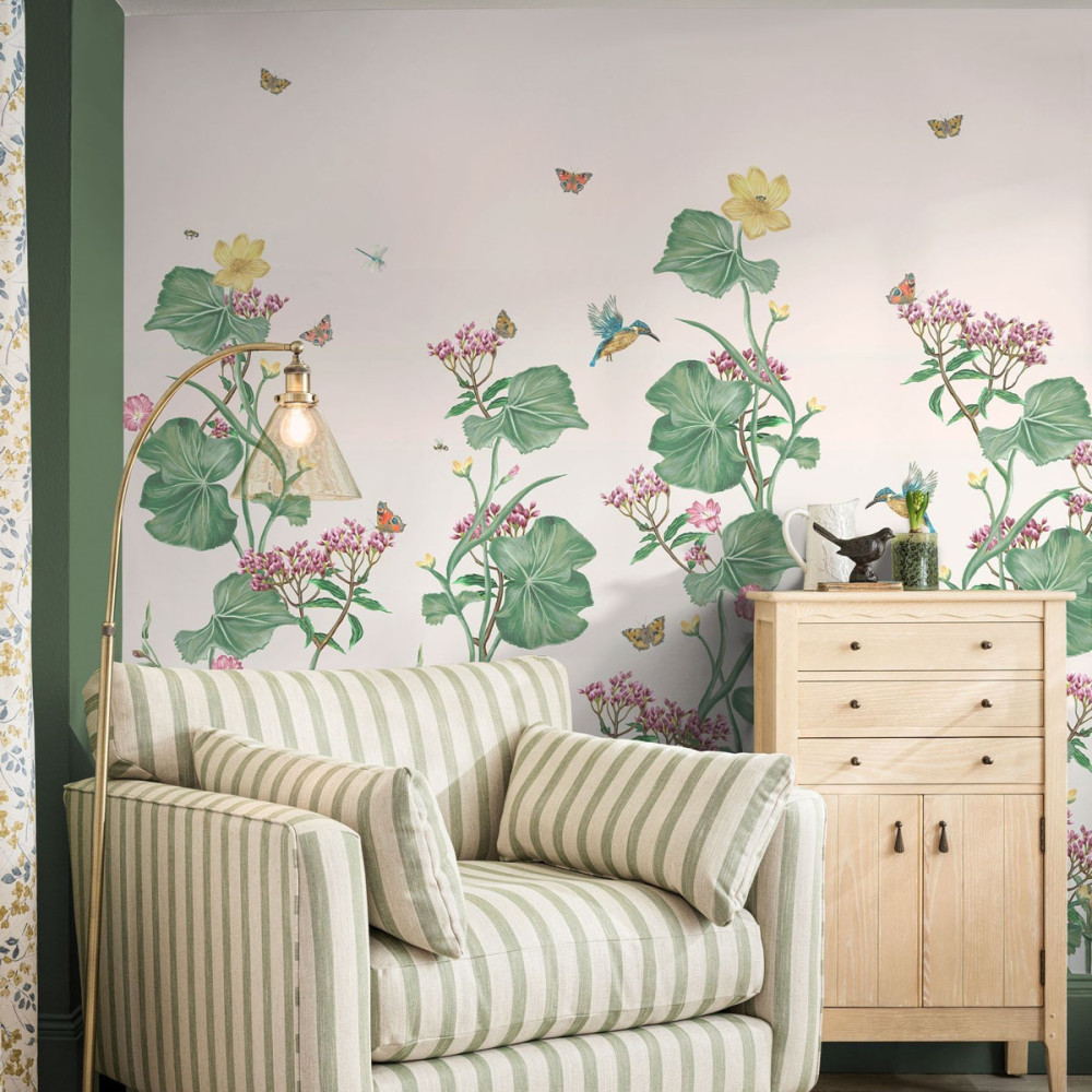 Mural de papel pintado con escena de humedales, martines pescadores y mariposas en tonos Green / Multi, lleno de vida y color.