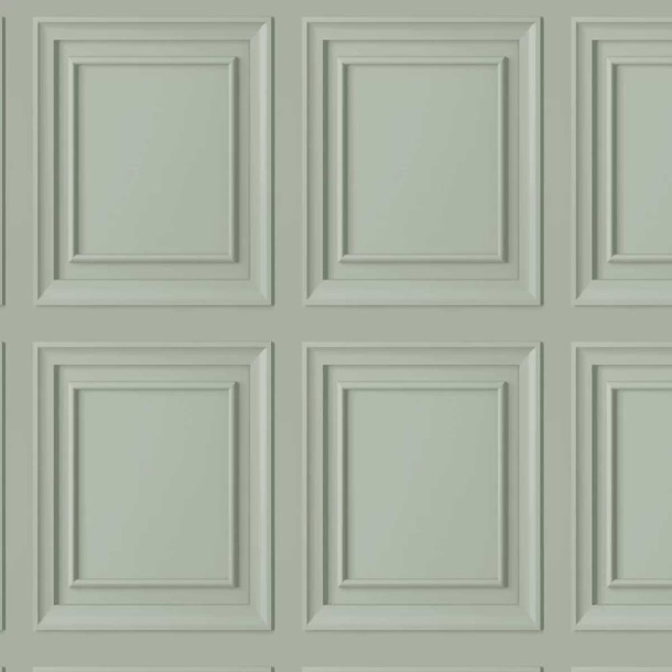 Simulando el aspecto atemporal de los paneles de madera, el papel de pared pintado de diseño rectangular Redbrook ofrece un atractivo a la moda y se muestra con estilo fresco y actual en este hermoso verde salvia.