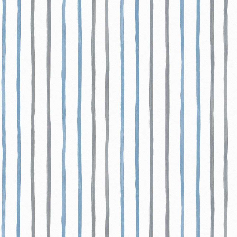 Papel pintado de Laura Ashley en color Azul. El patrón Painterly Stripe es un diseño atemporal de rayas azules verticales sobre un fondo blanco. Se presentó en el archivo de Laura Ashley en 2015, utilizado para una colección de dormitorios infantiles.