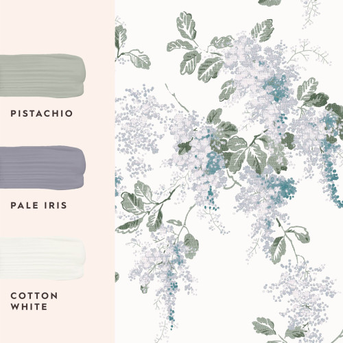 Papel pintado Mirabelle de Flores, en color Azul Mar Pálido, de Laura Ashley.