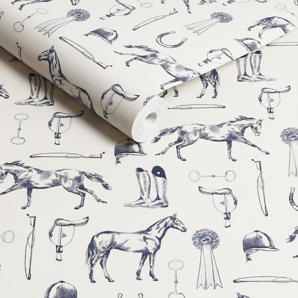 Papel pintado de elegantes siluetas de caballos y equipación ecuestre, como espuelas , fustas, herraduras y cascos, en color Crema/Azul. De Joules. Rollo 52 x 1000 cm
