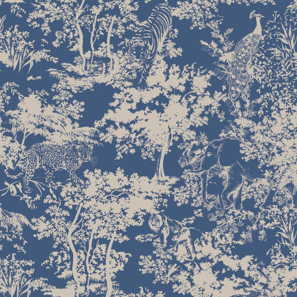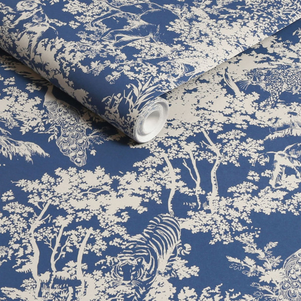 Papel pintado de original diseño clásico actualizado, estilo toile de Jouy, con bosques radiantes y animales escondidos, en color Azul. De Joules. Rollo 52 x 1000 cm