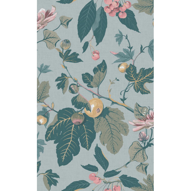 Papel pintado de que ofrece un estampado floral de hojas y frutos de granada que cautiva la vista. Este diseño destaca por su vibrante y armoniosa combinación de tonos azules, rosas y amarillos, para crear una atmósfera vivaz y acogedora. Tendencia color Cielo Azul. De Graham & Brown. Rollo 52 x 1000 cm