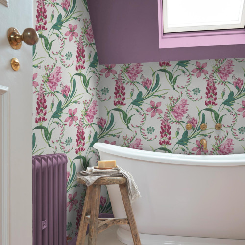 Papel pintado de encantadoras flores rosas, moradas y rojas entrelazadas con exuberantes hojas verdes, sobre un fondo blanco relajante, lo que lo convierte en la opción perfecta para tus proyectos de diseño de interiores. Tendencia color Malva y Azul Verdoso. De Graham & Brown. Rollo 52 x 1000 cm