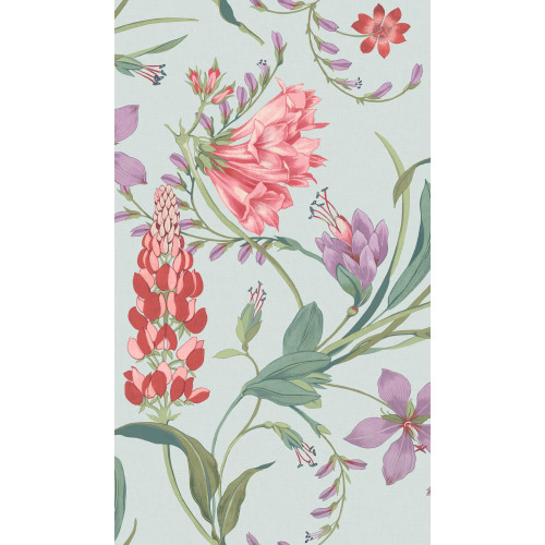 Papel pintado de encantadoras flores rosas, moradas y rojas entrelazadas con exuberantes hojas verdes, sobre un fondo azul verdoso, lo que lo convierte en la opción perfecta para tus proyectos de diseño de interiores. Tendencia color Azul Verdoso. De Graham & Brown. Rollo 52 x 1000 cm