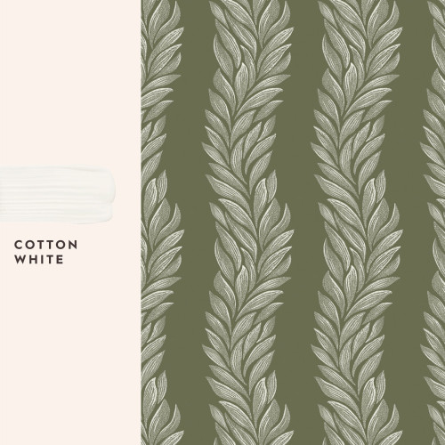 Papel pintado con hojas estilizadas en verde oliva. Diseño natural y elegante que aporta ritmo y frescura.