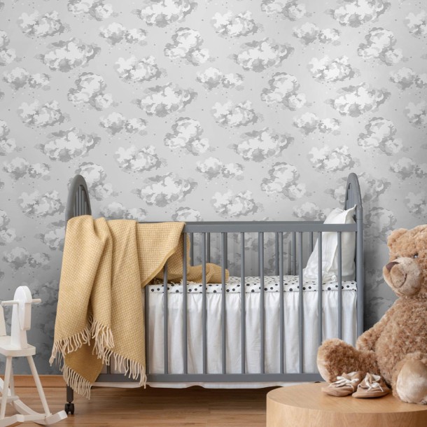 Papel pintado Cath Kidston con cielo nublado en tonos grises neutros y estrellas brillantes. Una opción versátil para crear ambientes relajantes y modernos.