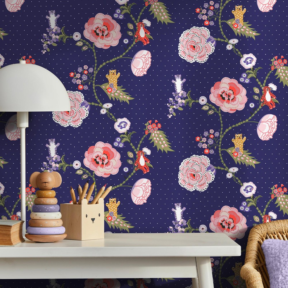 Papel pintado Cath Kidston con flores y gatitos en tonos claros sobre fondo azul marino. Encantador y divertido, perfecto para dormitorios y espacios juveniles.