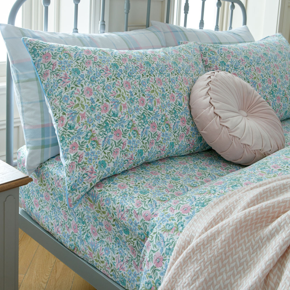 Sábana Bajera Ajustable estampada con pequeñas flores rosas, azules y verdes, realizada en 100% algodón, de Laura Ashley.