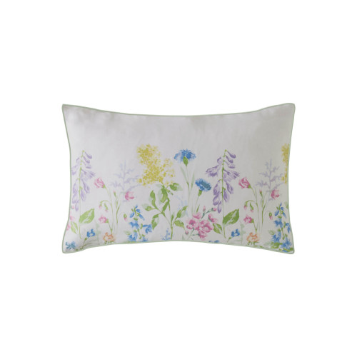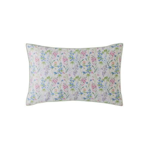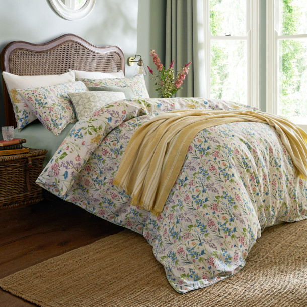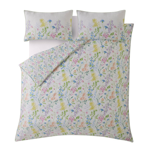 Set de Cama Elston Garden de diseño floral de acuarela con flores silvestres. Reverso de flores pequeñas, impreso sobre una base de satén de algodón 100 % de 200 hilos y terminado con ribete verde.