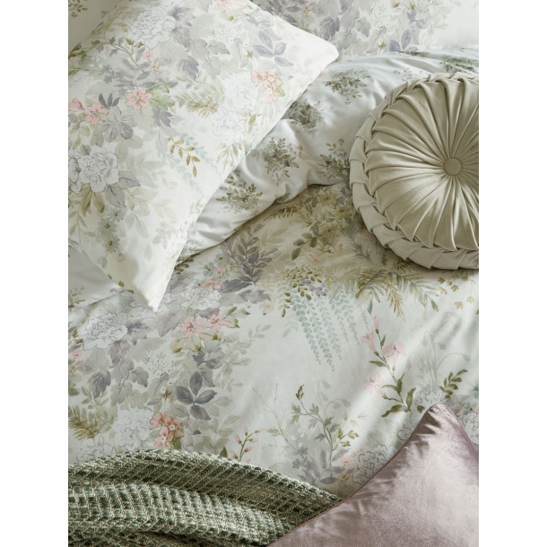 Set de Cama Linlithgow, estampado con flores y follaje de acuarela. Reverso de florecitas, una base de satén de algodón 100 % de 220 hilos y borde afilado.