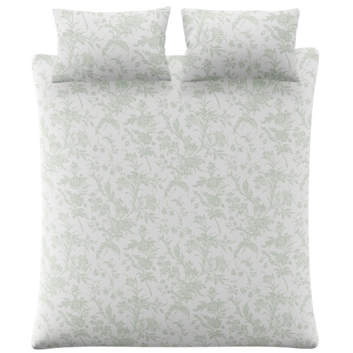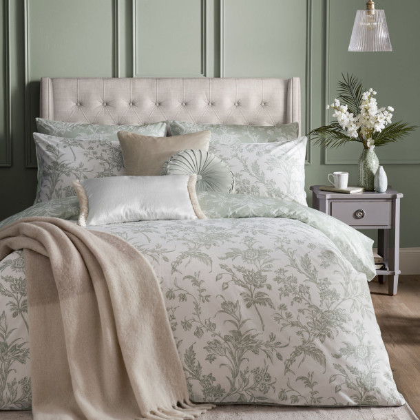 Set de Cama Lloyd, con un diseño floral estampado romántico. Intrincados detalles dibujados a mano impresos sobre percal de algodón de 200 hilos al 100% sobre un fondo verde salvia relajante.