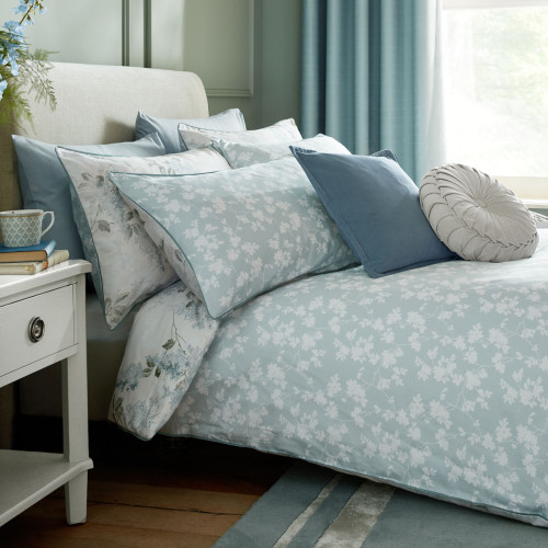 Set de Cama Mirabelle con ramas de árboles de color lila y hojas. Tonos azul y verde añaden una sensación fresca y elegante, realzada por una lujosa base de satén de algodón 100 % de 220 hilos y borde de ribete plano.