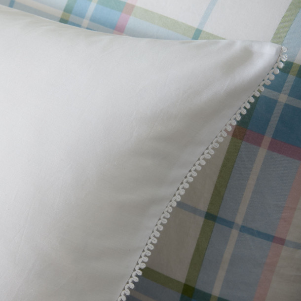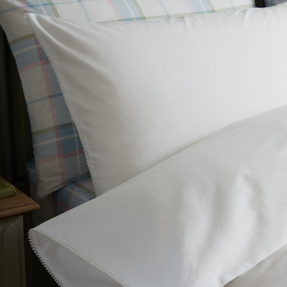 Set de Cama Rianne blanco con detalle de ribete bordado. En un percal de algodón 100 % de 200 hilos, esta ropa de cama es hermosa tanto por sí sola como en capas con otros hermosos estampados disponibles.