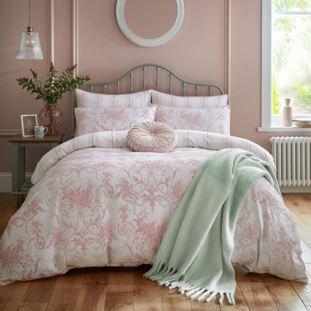 Set de Cama Tuleries romántico, monocromático, estilo Toile de Jouy para este lujoso satén de algodón 100 % de 200 hilos en tonos rosa talco. Acabado con uribete plano.