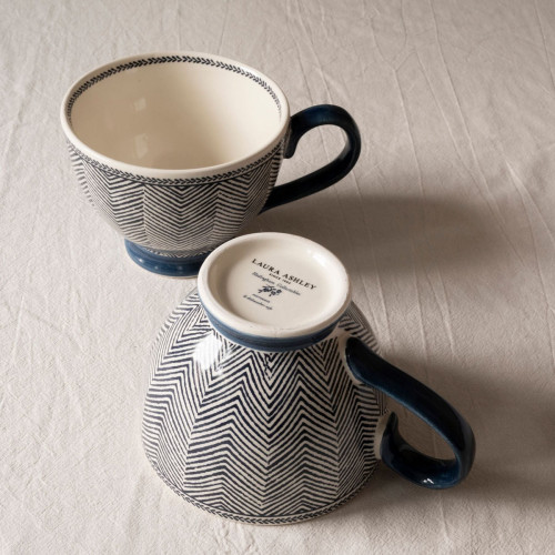 Taza grande de desayuno Edwin, de Laura Ashley, en loza cerámica estampada con patrón de espiga en color azul cerámica. Base, asa y ribete en color azul.