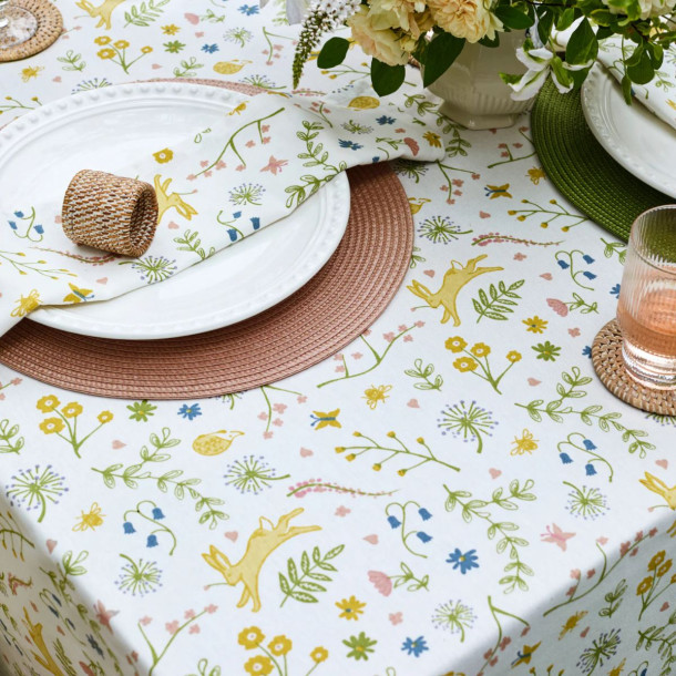 Mantel de algodón estampado con un diseño primaveral de flores, hojas y liebres, en tonos verdes, azules, rojas y amarillos, sobre radiante fondo blanco.