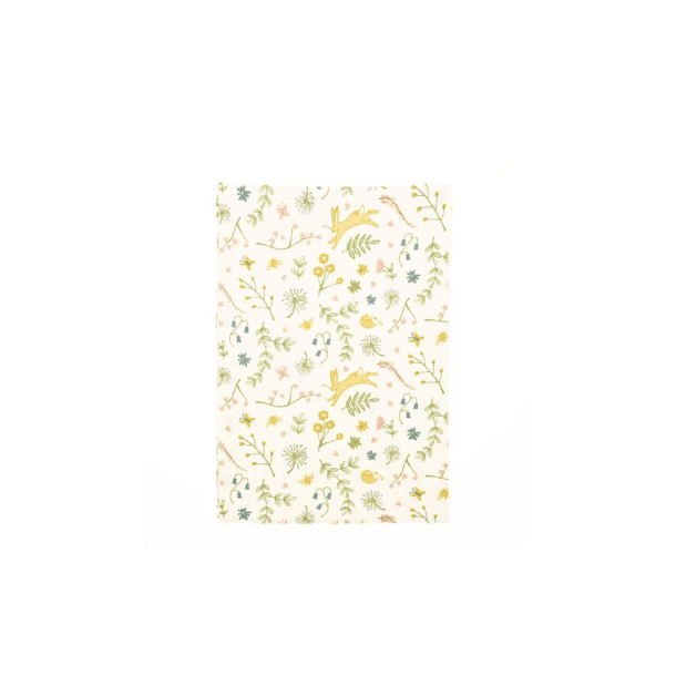 Set de 2 trapos de cocina de algodón estampado con un diseño primaveral de flores, hojas y liebres, en tonos verdes, azules, rojas y amarillos, sobre radiante fondo blanco.